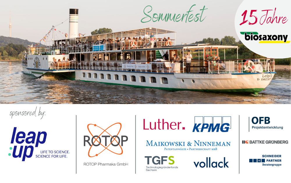Special thanks go to the biosaxony members, network partners, industry supporters, the employees of the Saxon State Ministries, the economic development organisations of the Leipzig, Dresden, Radebeul and Radeberg city councils, the Saxony Economic Development Corporation, the Saxon Development Bank and the sponsors of the anniversary celebration.