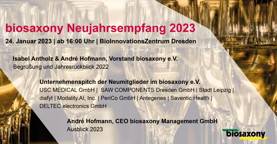Wir laden Sie recht herzlich am Dienstag, den 24. Januar 2023 ab 16.00 Uhr zu unserem biosaxony Neujahrsempfang in das BioInnovationsZentrum Dresden ein.