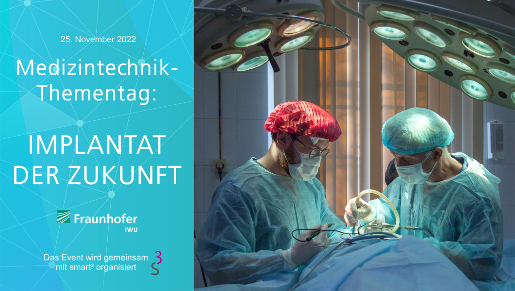 Der Medizintechnik-Thementag am 25. November 2022 in Dresden steht unter dem Motto »Implantat der Zukunft« und beschäftigt sich mit Entwicklungen und Trends sowie den speziellen Anforderungen und Herausforderungen der Implantat-Branche. Dazu laden die Abteilung Biomechatronics des Fraunhofer IWU, das Universitätsklinikum Leipzig und der smart³ e. V. herzlich nach Dresden ein.